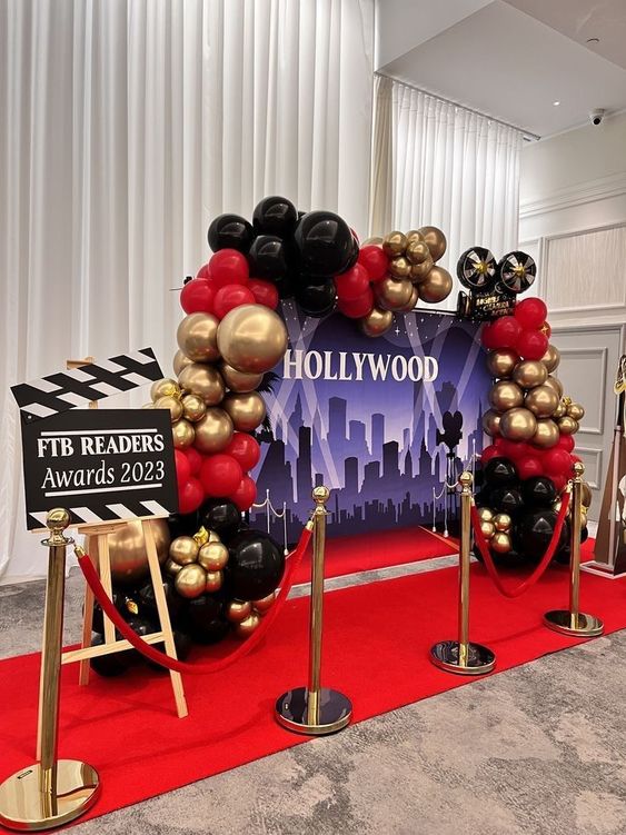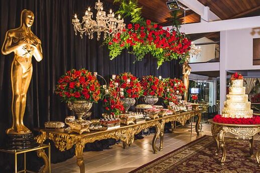 Haz que tus invitados se sientan como estrellas de cine con una noche de glamour al estilo de Hollywood. Utiliza alfombras rojas, cintas de terciopelo y mucho brillo. Coloca carteles de películas clásicas y crea una zona de fotos con telón de fondo dorado. No olvides los detalles, como estatuillas de premios y estrellas con los nombres de tus invitados. Puedes incluso contratar a actores para hacer de paparazzi y crear un ambiente más auténtico.