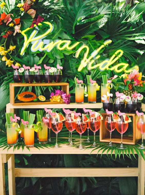 Transporta a tus invitados a una isla paradisíaca con una fiesta tropical. Usa colores vibrantes como el verde, amarillo y rosa. Decora con hojas de palma, flores exóticas y piñas. Coloca luces de cadena y linternas de papel para crear un ambiente cálido. Mesas decoradas con manteles de lino blanco, centros de mesa con cocos y flores, y estaciones de bebidas con piñas y sombrillitas completan la experiencia. No olvides ofrecer cócteles tropicales y snacks de frutas frescas.